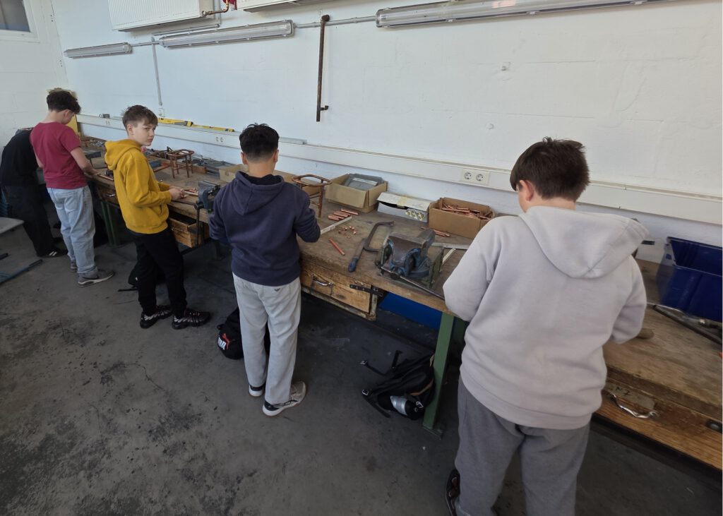 Anhand von Schlüsselanhängern und Handystativen erprobten die Schülerinnen und Schüler Grundfertigkeiten der Metallbearbeitung.