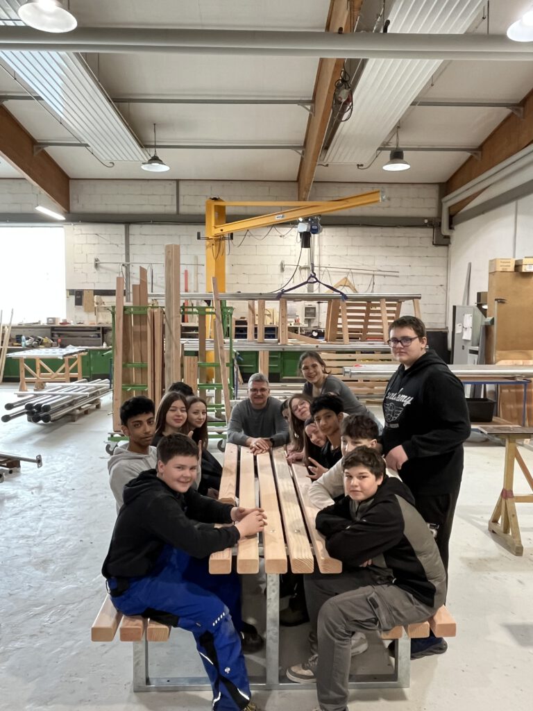 Die Firma Spessart Holzgeräte motivierte die Schülerinnen und Schüler zu einer Gemeinschaftsaufgabe. Ziel war es eine „Kompakt-Sitzgruppe“ herzustellen.