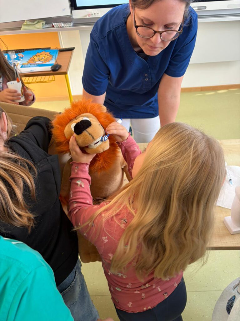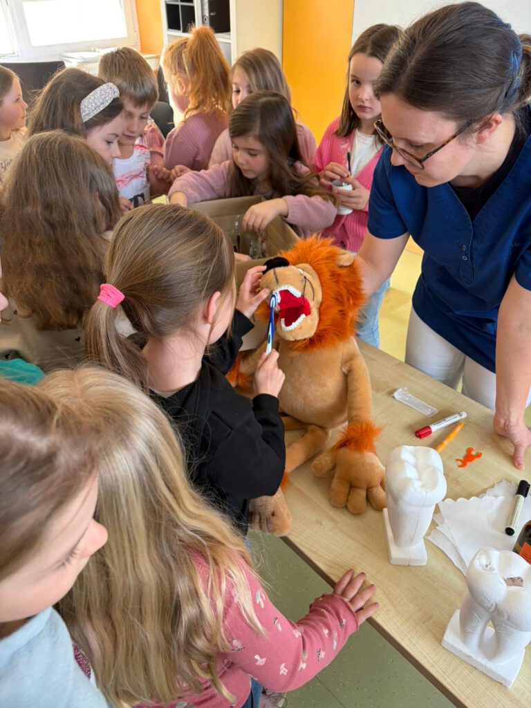 Besonders viel Spaß hatten die Kinder mit dem Löwen Dentulus, der seine Zähne nicht immer gründlich putzt. An dem großen Löwen durften die Kinder üben, wie man seine Zähne richtig reinigt. Das fanden alle sehr spannend.