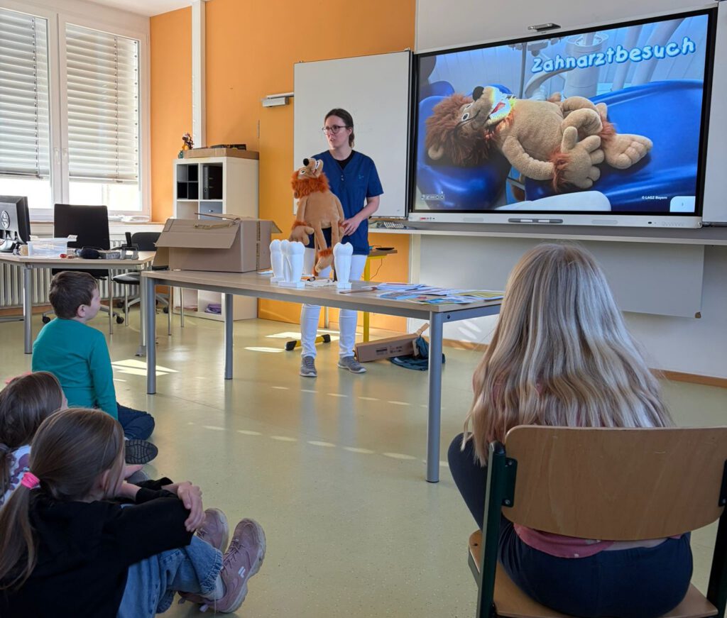 Am Donnerstag, den 12.03.26 bekamen die Eingangsklassen der Grundschule Faulbach Besuch von der Zahnärztin Frau Dr. Ulbrich. Nachdem die Kinder im Unterricht bereits vieles zum Thema Zähne gelernt hatten, freuten sie sich sehr über den Gast und hörten gespannt zu.